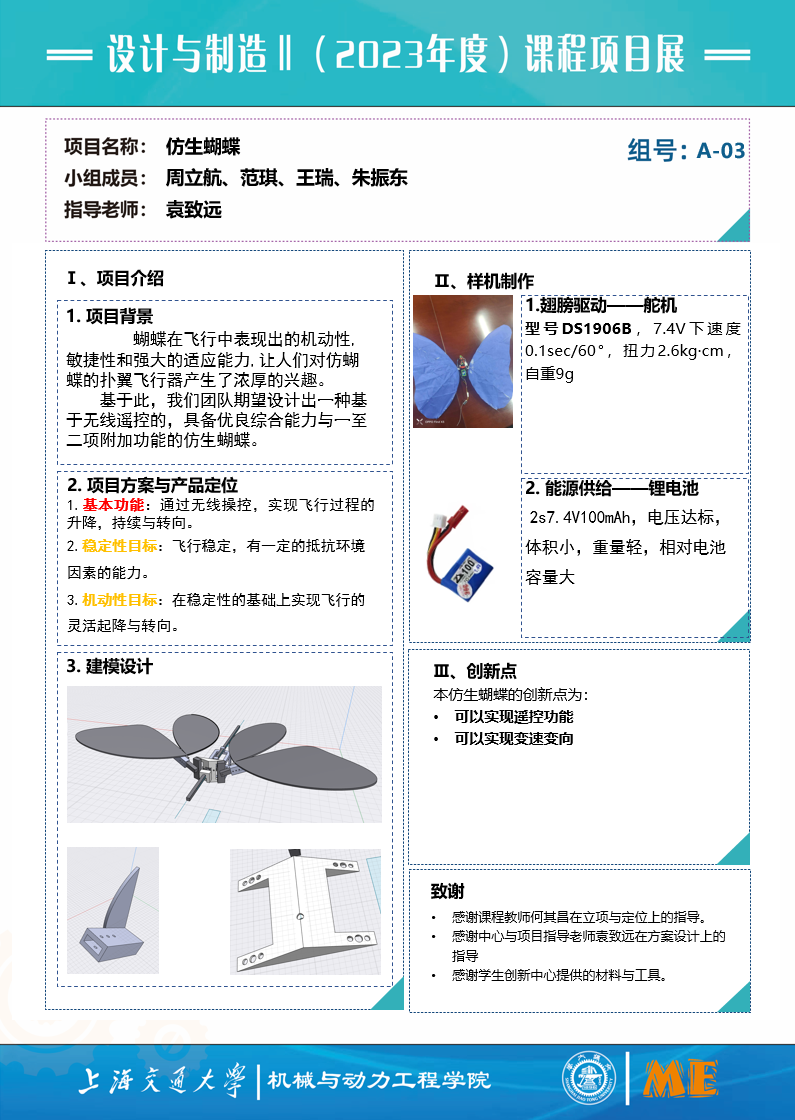 1、实现具有基本功能和外形的仿生蝴蝶制作。
