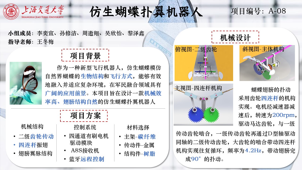 仿生蝴蝶项目旨在通过模仿自然界中蝴蝶的飞行特性,开发一种具有高度自主性和灵活性的微型飞行器,通过深入研究蝴蝶的飞行机制和飞行原理,利用机械、力学、材料等知识,创造一种既能够模仿蝴蝶飞行方式,又具备强大功能的飞行器。该项目通过电机带动齿轮转动,采用轮系设计达到凸轮机构的效果,并传递扭矩,实现连杆机构运动,带动转动臂转动,从而使得翅膀扇动,最终实现蝴蝶的飞行。