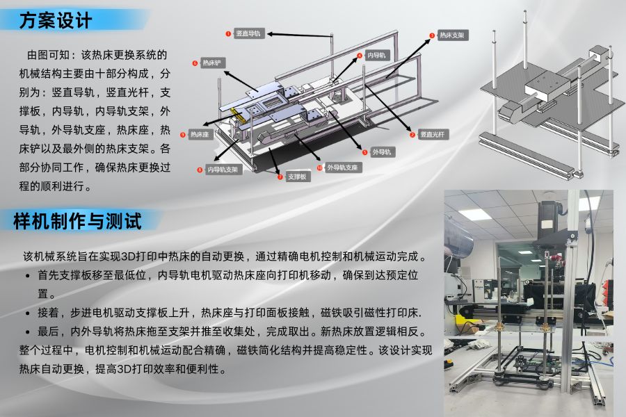 首先,系统接收到换床信号时,支撑板移至最低位。此时,电机驱动热床座向打印机移动,确保A侧到达预定位置。