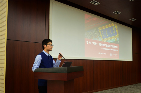 在优秀党员分享环节,2015级博士研究生、2018年国家奖学金获得者许锐从参与项目、科研历程和论文、专利撰写等方面分享了自己的心得体会。2016级硕士研究生杜政瑀选择了前往中国核动力研究设计院就业,介绍了其就职单位,并分享了自己的求职过程。2015级博士研究生胡振枭就自己为什么选择成为选调生、如何准备选调生考试和面试等跟同学们做了交流。