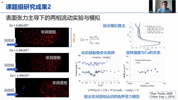 制冷与低温工程研究所助理教授杨光报告主题为“航天低温推进剂的在轨气液分离技术与机理”,他着眼于地月空间任务以及空间站建设等航天领域国家重大研发规划,分析了液氧/液氢低温推进剂在未来深空探测应用中的优势,从惯性式分离、表面张力式分离等方面介绍了气液分离技术的研究现状与研究趋势,提出了利用液氧的顺磁性对液氧进行磁补偿从而模拟空间真实微重力环境的方法,展示了表面张力主导下的两相流动实验与模拟结果,介绍了多孔网幕流动压降通用解析模型,呈现了基于微纳复合金属网幕的低温流体润湿与泡破特性,通过改进表面结构,大幅提高了网幕的芯吸能力。