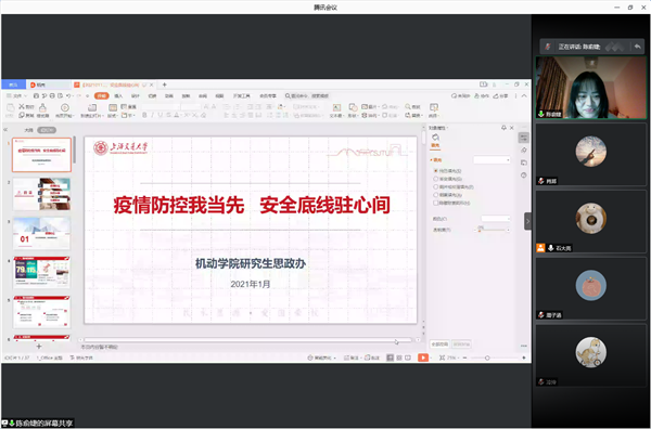 1月16日晚,新能源动力研究所于线上召开防疫安全教育大会,本次大会主题为“疫情防控我当先,安全底线驻心间”。会议由新能源动力研究所硕士生党支部书记石大亮主持,系所研究生班主任吕兴才、石磊、思政老师陈俞婕及系所全体研究生出席本次会议。