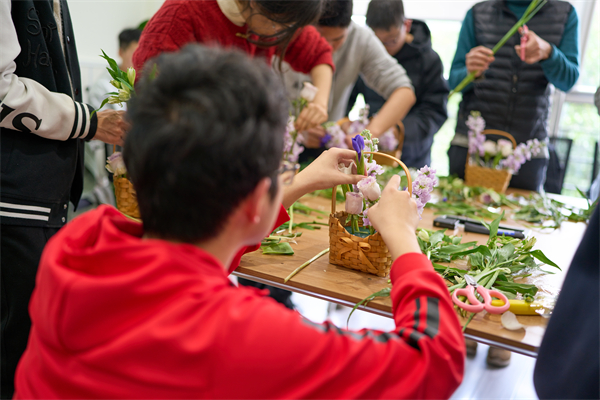 讲解过程中,同学们认真聆听,不时询问。讲解完成后,同学们跟随陈思乐的演示,开始了插花实践,各位同学基于自己的想法和所学到的插花知识,对花篮进行了设计。