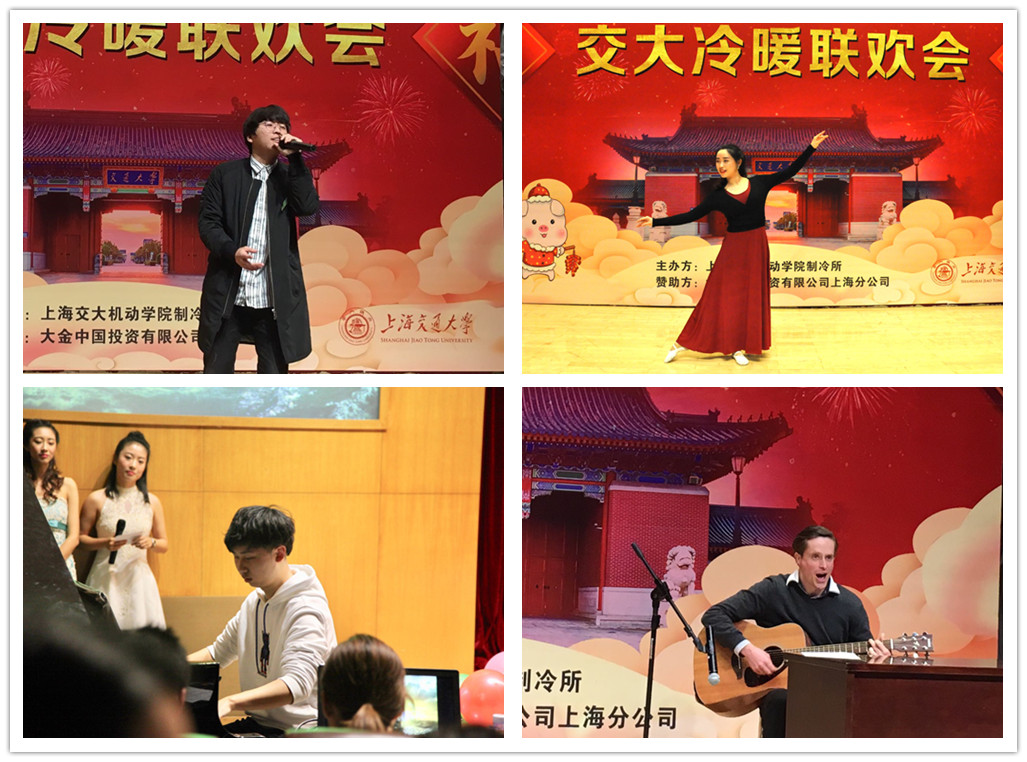 晚会在师生的《波尔卡圈圈舞》中拉开序幕,制冷所学子们演唱了《不为谁而作的歌》、《My Love Story》、《Perfect》,表演了古典探戈舞蹈《 Por Una Cabeza》,诗朗诵《致敬交大》,钢琴独奏《He’s a Pirate》以及魔术《预言术》。大金公司嘉宾带来了二胡独奏《赛马》。节目中间穿插了趣味游戏和抽奖环节,引来欢声笑语。