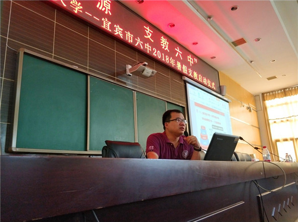 14日上午,“饮水思源,支教六中”支教启动仪式在宜宾六中明德讲堂举行,宜宾六中副校长冯贵友、学生发展中心主任蔡明、高一年级主任邓文娟、各年级教师以及90多名学生,顾希垚老师及支教团全体成员出席启动仪式。冯贵友致欢迎辞,他指出,“我住长江头,君住长江尾”,上海交大与宜宾六中的友谊源远流长,上海交通大学校长林忠钦院士是宜宾六中的知名校友,多年来心系母校发展,他代表宜宾六中对上海交大代表团的到来表示欢迎。顾希垚表示,支教团是“因为一群人,爱上一座城”,正是因为六中这群可爱的老师和同学,使“万里长江第一城”的宜宾更加美丽动人,让人流连忘返。顾希垚提出了两点希望:第一,希望以支教活动为契机,建立起沟通纽带,拉近两校距离,让六中与交大同呼吸、共命运;第二,希望支教团成员深入了解宜宾六中,了解中西部地区的教育发展,引导同学们树立“扎根西部、服务西部”的意识。蔡明做最后总结,希望宜宾六中的同学能够养成“专注、思考、实践”的学习习惯,在活动中有所收获。