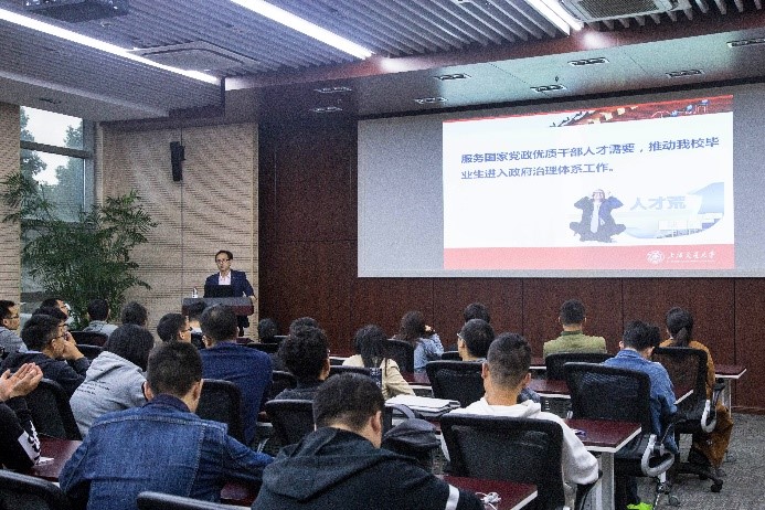 顾希垚结合国内选调生政策的发展历程以及在湖北、湖南等地的调研经历,讲述他眼中的选调生政策和未来发展前景。他通过学院的就业情况和优秀校友范例,勉励同学们树立家国情怀、用发展的眼光看待职业生涯选择,抓住历史机遇,在祖国的大地上挥洒青春,开创交大人的伟大事业。
